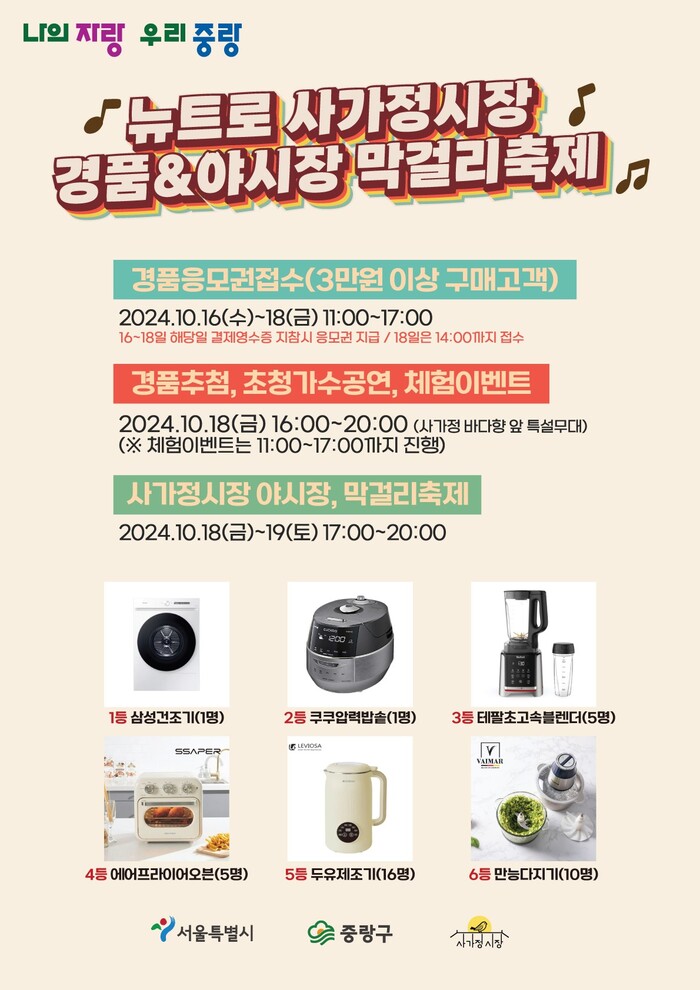축제는 18일 오후 5시부터 사가정시장(사가정로53길 21)에서 초대 가수의 공연으로 시작되며, ▲경품 추첨 ▲지역 동아리 예술인 공연 ▲페이스페인팅과 캐리커처 등 다채로운 체험 프로그램이 준비되어 있다. 또한, 1만 원 이상 구매 시 막걸리 1병을 제공하는 특별 이벤트도 진행해 관람객들의 큰 호응을 기대하고 있다.