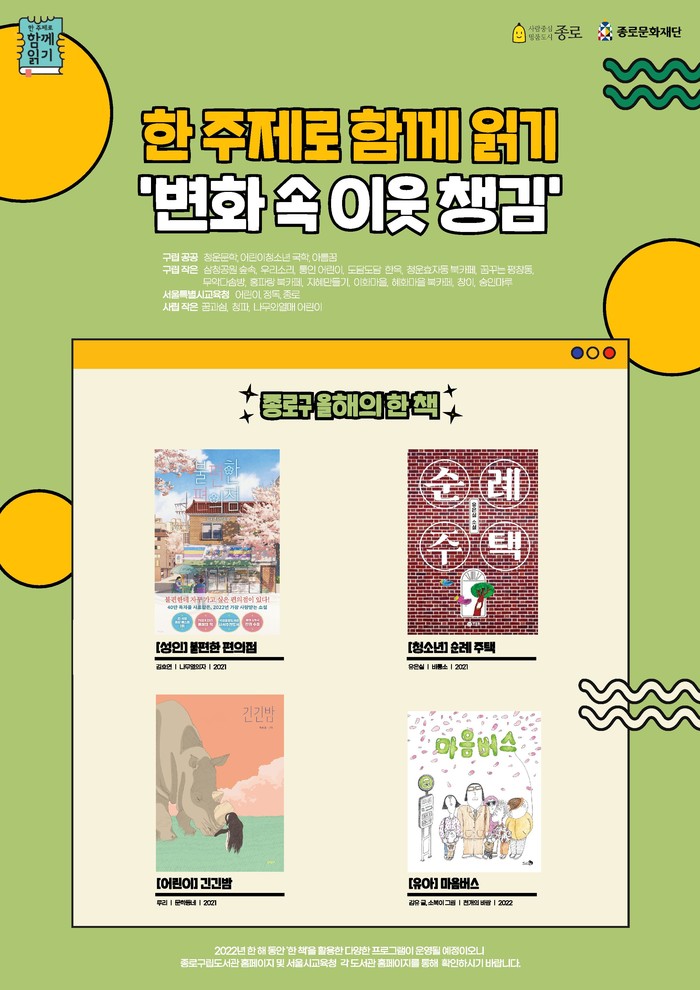 한 책을 중심으로 올해 하반기 내내 계속될 독서 프로그램 관련 정보는 종로구립도서관과 종로문화재단 홈페이지를 참고하면 된다.