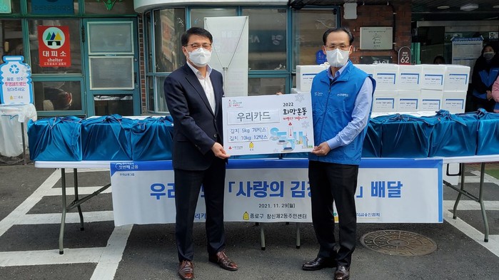 종로구 혜화동 주민센터와 창신2동 주민센터에 추운 겨울을 맞아 1사1동 결연을 맺은 기업 후원이 이어지고 있다. 사진은 최근 창신2동에 우리카드가 김장김치 총 500kg를 취약계층에 전달해 달라며 후원하고 있는 모습. (사진제공=종로구청)
