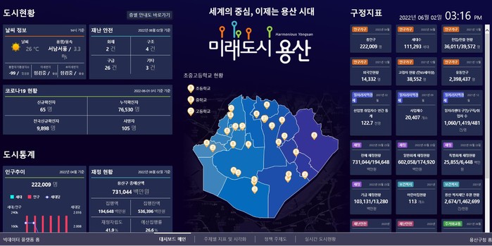 아울러 구 디지털 종합 현황판 격인 대시보드는 용산구종합행정타운 지하 2층 민원실 로비, 용산구꿈나무종합타운 1층 로비에 설치된 터치스크린을 통해 제공된다.