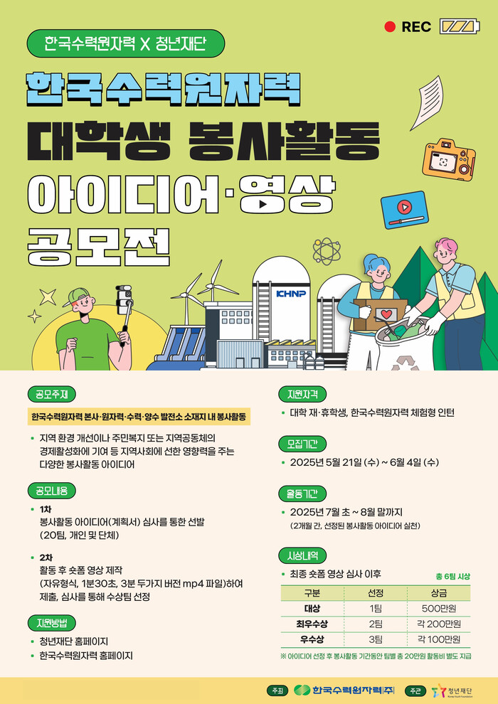 [시민일보 = 문민호 기자] 한국수력원자력과 청년재단이 함께, 지역사회에 따뜻한 변화를 일으킬 청년들의 마음을 모은다. ‘대학생 봉사활동 아이디어.영상 공모전’ 참여팀 모집이 5월 21일부터 6월 4일까지 진행된다.