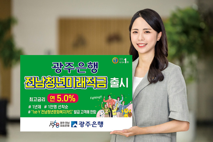 [시민일보 = 이대우 기자] 광주은행(은행장 송종욱)은 전남청년 문화복지카드 ‘1st-Y 전남청년 문화복지카드’ 출시를 기념해 1만좌 한정 특판으로 진행하는 ‘전남청년 미래적금’을 출시했다고 밝혔다.