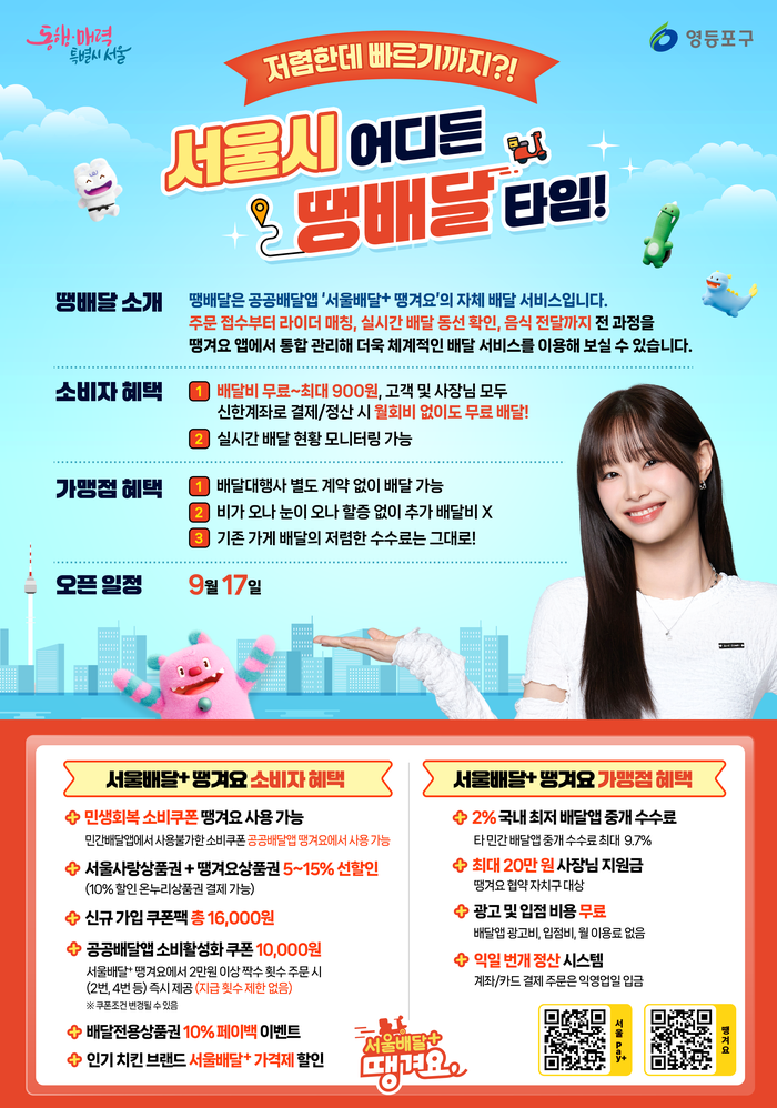 [시민일보 = 여영준 기자] 영등포구(구청장 최호권)가 높은 수수료와 배달료로 어려움을 겪는 소상공인과 소비자의 비용 부담을 줄이기 위해 지난 17일부터 구 전역에서 ‘땡배달’ 서비스를 본격 운영하고 있다고 밝혔다.