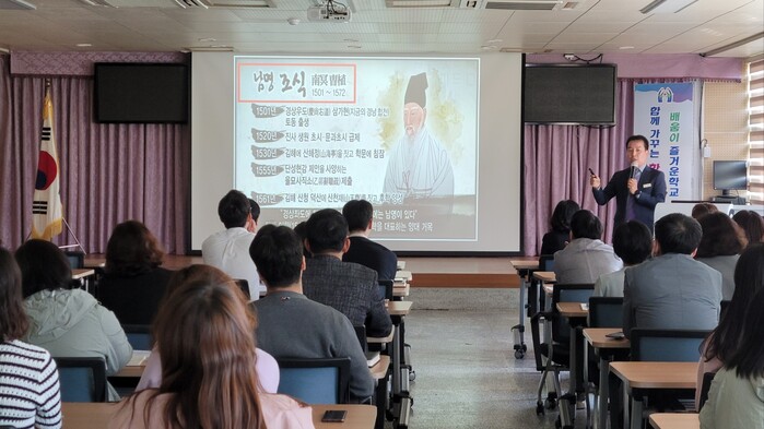 이번에 새롭게 전입한 황상주 장학사는 “합천에서 태어난 남명조식 선생의 생계 및 업적에 대한 이해를 통해 남명 조식의 사상과 실천정신을 재밌게 배울 수 있는 기회가 되었다.” 라고 소감을 전했다.