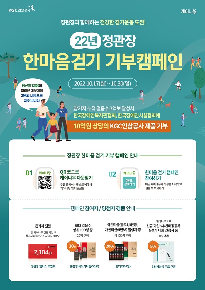 최다 걸음 수, 착한마음 플로깅 인증 등의 개인 미션을 수행한 참가자는 추첨을 통해 정관장 제품을 지급하고, 걷기 캠페인 신청자 중 케어나우 3.0 신규가입 및 가입 추천 매장 등록을 한 참가자는 36만원 상당의 유전자 분석 검사 무료 쿠폰 등의 다양한 경품 행사에도 참여할 수 있다.