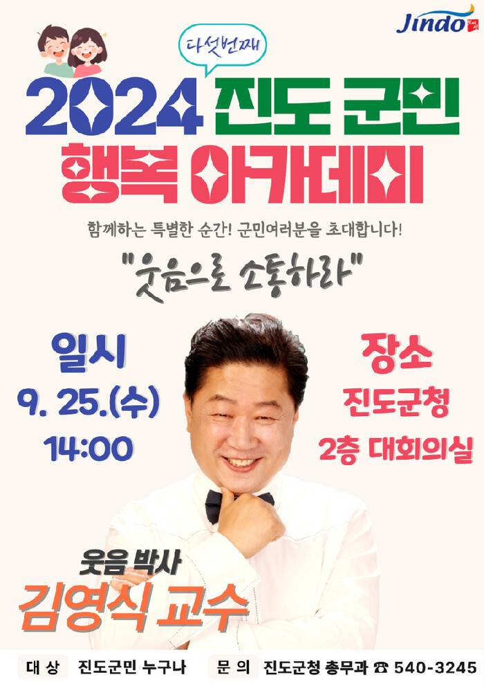 [진도=황승순 기자] 전남 진도군이 올해 다섯 번째 '진도 군민행복 아카데미' 강연을 오는 25일 수요일 오후 2시 군청 대회의실(2층)에서 전군민을 대상으로 개최한다.