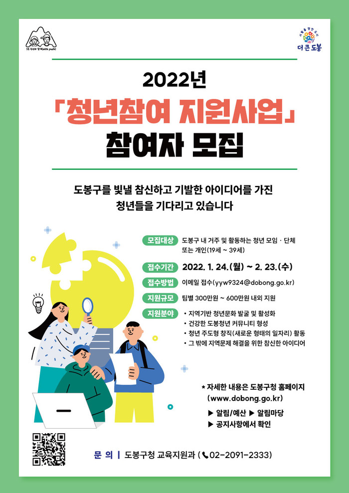 [시민일보 = 여영준 기자] 도봉구(구청장 이동진)는 오는 23일까지 '2022년 청년참여 지원사업' 참여자를 모집한다고 3일 밝혔다.
