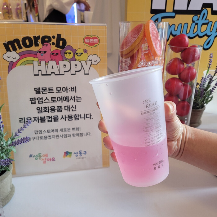 | ▲ 성동구는 성수동 팝업스토어 시음 행사 시 다회용컵을 지원했다. 7월 델몬트 팝업스토어에서 다회용컵을 사용한 모습. (사진=성동구청 제공) |