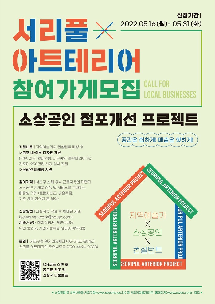 모집 대상은 서초구 소재 상시근로자 5인 미만의 소상공인 가게로 상품 및 서비스를 구매하는 매장형 가게이다. 단, 프랜차이즈가맹점, 유흥업종 가게, 지난해 서초구 아트테리어사업에 참여한 가게는 지원대상에서 제외된다.