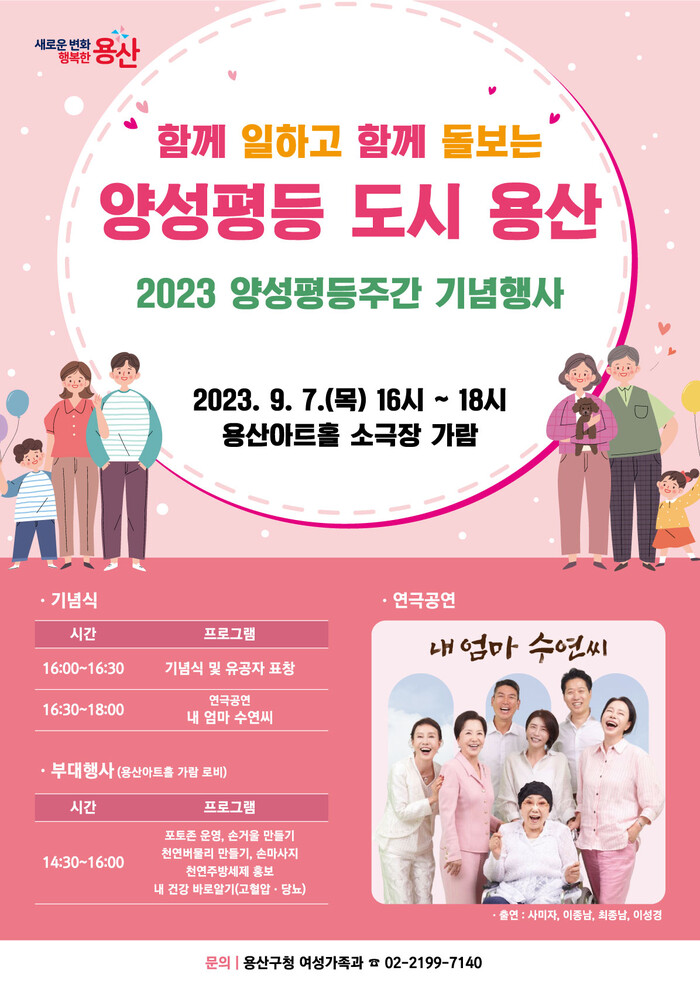[시민일보 = 홍덕표 기자] 용산구(구청장 박희영)가 양성평등주간(9월1~7일)을 맞아 오는 7일 용산아트홀(녹사평대로 150 1층) 소극장 가람에서 기념행사를 개최한다.