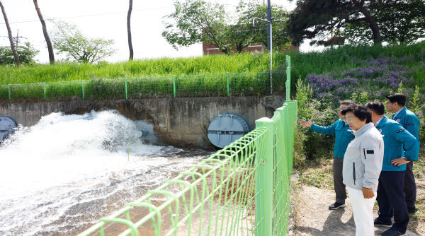 경기 이천시가 최근 재난안전대책본부장(김경희 시장) 주관으로 여름철 재난 대비 실태를 확인하고 미흡한 점을 보완하기 위해 방재시설(노탑배수펌프장)과 침수 우려 지역(오남2리 일원)을 점검했다. 사진은 김 시장이 관계자들과 방재시설을 살피는 모습. (사진=이천시청 제공)