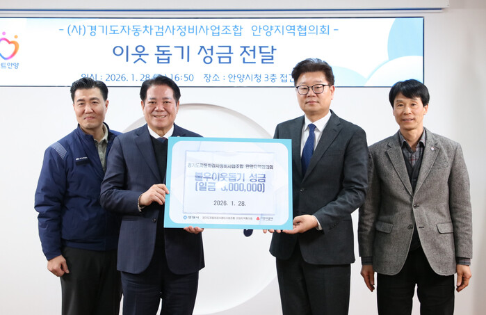 [안양=송윤근 기자] 경기 안양시는 28일 오후 4시50분에 시청 3층 접견실에서 (사)경기도자동차검사정비사업조합 안양지역협의회가 설 명절을 앞두고 지역내 어려운 이웃을 위해 사용해 달라며 성금 300만원을 기탁했다고 29일 밝혔다.