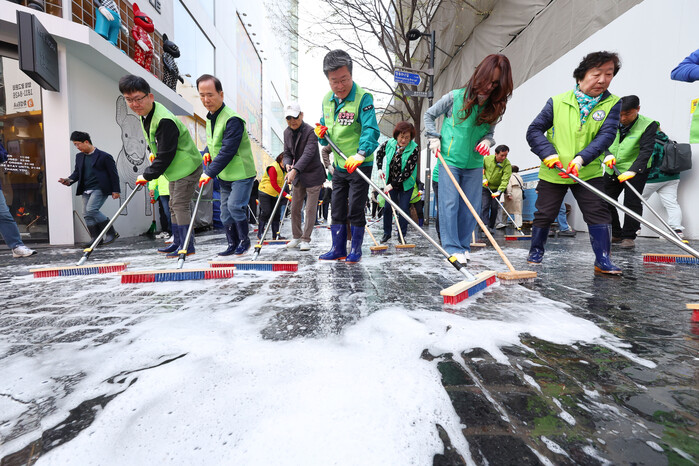 16일 서울 중구 명동거리에서 중구청과 명동 주민센터 직원, 명동관광특구 상인회, 자원봉사자들이 봄맞이 물청소를 하고 있다.