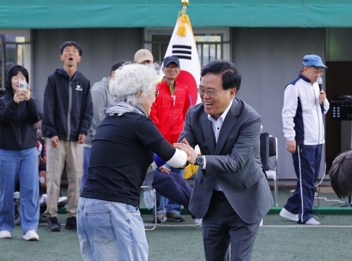 진교훈 서울 강서구청장이 최근 방화대교 남단 게이트볼장에서 열린 ‘샬롬의 집 운동회’와 가양레포츠센터에서 열린 ‘강서구상공회 한마음 단합대회’를 찾아 주민과 소통했다. 사진은 샬롬의 집 운동회를 찾은 진 구청장(오른쪽)이 주민과 인사하는 모습. (사진=강서구청 제공)