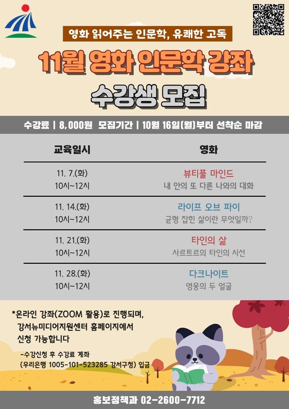 | ▲ 11월 영화 인문학 강좌 안내문. (사진=강서구청 제공) |