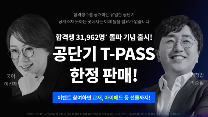 티패스 상품 출시를 기념한 이벤트도 진행한다. 티패스에 대한 기대평을 홈페이지에 남기면 공단기 인기 선생님의 2025대비 신규 교재와 아이패드, 애플워치, 네이버페이 포인트 등 약 1,000만원 상당의 경품을 제공한다.
