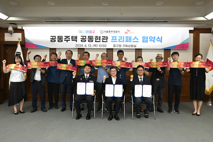 [시민일보 = 여영준 기자] 중구(구청장 김길성)는 최근 중부경찰서 및 SK쉴더스와 사업의 원활한 추진과 견고한 협력체계를 구축하기 위해 '공동주택 공동현관 프리패스' 협약을 체결했다고 18일 밝혔다.