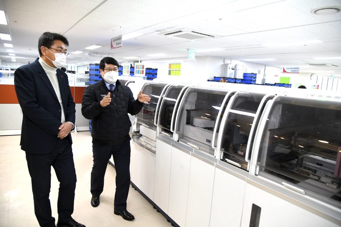 오승록 노원구청장은 최근 (재)씨젠의료재단을 방문해 2022 희망온돌 따뜻한 겨울나기 성금으로 1억원을 기부받고, 씨젠의료재단의 코로나19 PRC 검사실 등 시설 등을 둘러봤다. 사진은 오 구청장(왼쪽)이 관계자와 코로나19 PRC 검사실 등 시설을 둘러보고 있는 모습. (사진제공=노원구청)