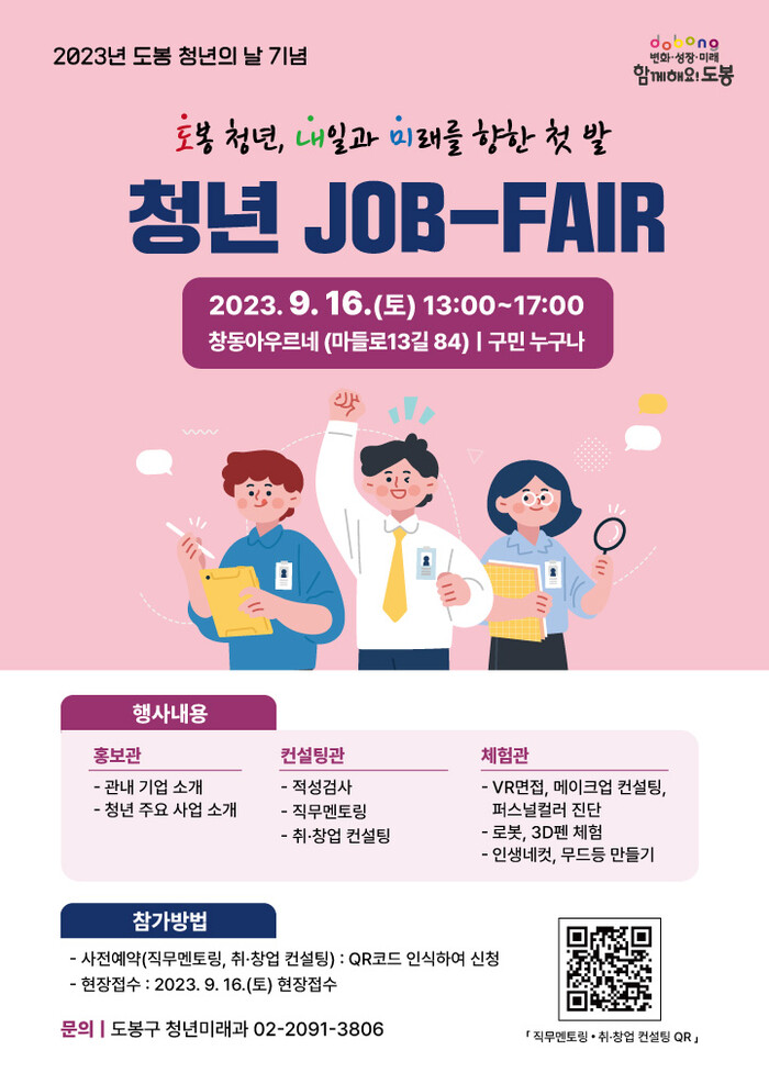 [시민일보 = 여영준 기자] 도봉구(구청장 오언석)는 2023년 도봉 청년의 날을 맞아 오는 16일 오후 1시 창동 아우르네(마들로13길 84)에서 취·창업 정보를 제공하는 ‘청년 JOB-FAIR’를 개최한다고 밝혔다.