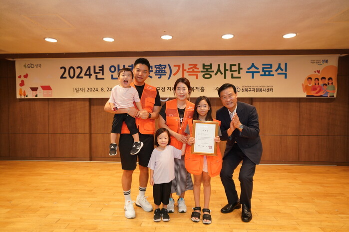 서울 성북구가 최근 '2024년 안녕가족봉사단 수료식'을 개최했다. 이번 안녕가족봉사단 프로그램은 5개월간 35가족이 7회기에 걸쳐 참여했으며, 발대식 및 기후위기와 실천활동 등의 과정을 거쳐왔다. 사진은 이승로 구청장이 수료증을 받은 한 가족과 기념촬영을 하고 있는 모습. (사진=성북구청 제공)
