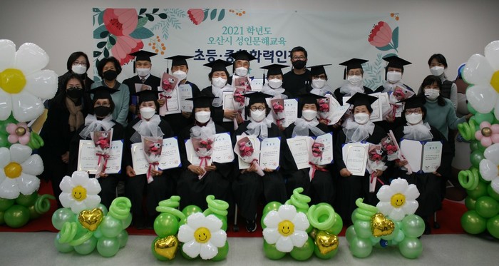 경기 오산시가 16일 2021학년도 오산백년한글학교 성인문해교육 초등·중학학력인정 졸업식을 개최했다. 2021년 초등·중등과정은 코로나19로 인해 대면과 비대면 수업을 병행했으며, 수업은 과제형 수업 등으로 운영했다. 사진은 이날 졸업식에서 졸업생들이 기념촬영을 하는 모습. (사진제공=오산시청)