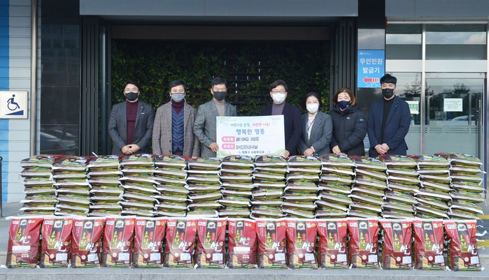 SH인터내셔날이 2일 코로나19로 어려움을 겪고 있는 저소득층 가정 등을 위해 쌀(10kg) 300포를 경기 수원시 영통구에 전달했다. 이날 기부받은 쌀은 지역내 저소득층 위기가정, 한부모가정, 홀몸노인, 사회복지시설 등 소외계층에 전달될 예정이다. 사진은 관계자들이 기념촬영을 하는 모습. (사진제공=영통구청)