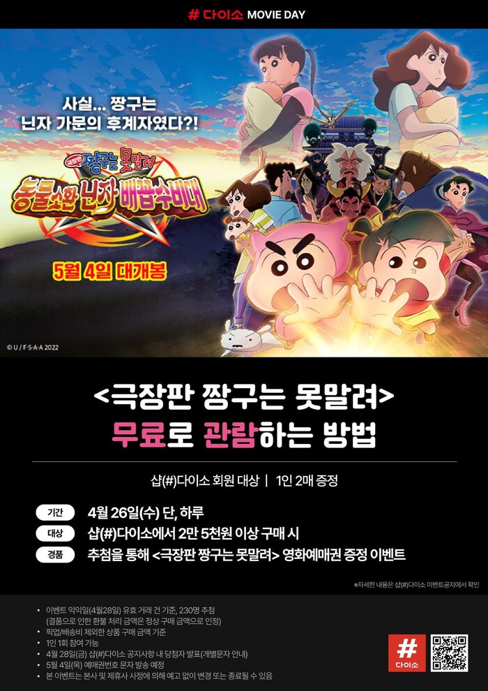 이번 이벤트는 26일, 하룻동안 진행하며 샵다이소에서 2만 5000원 이상 구매 시 추첨을 통해 5월 4일 개봉 예정인 <극장판 짱구는 못말려: 동물소환 닌자 배꼽수비대> 영화 애매권을 증정한다.