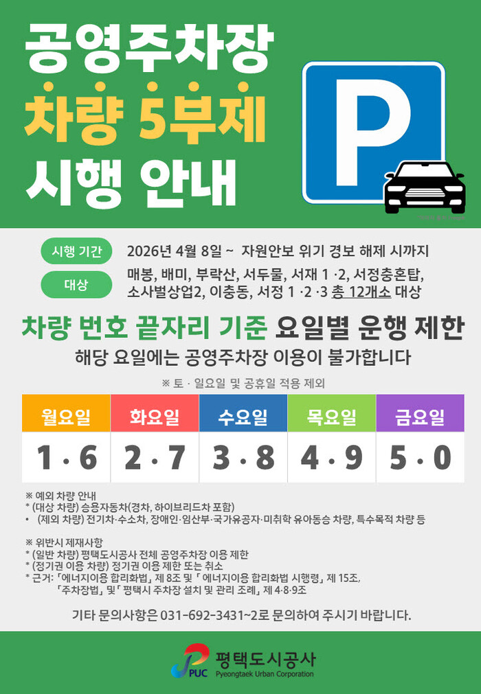 한편, 공영주차장 승용차 5부제 운영과 관련한 세부 사항은 평택도시공사 공영주차장 홈페이지 및 현장 안내문을 통해 확인할 수 있다.