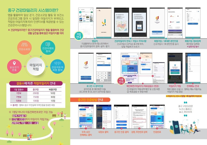 중구건강마일리지 앱은 일상 속 걷기 문화 조성을 위해 2021년 중구에서 자체 개발한 앱이다. 지난해 조사한 중구정책 탑 10에서 3위에 선정될 만큼 주민들에게 인기를 얻고 있다.