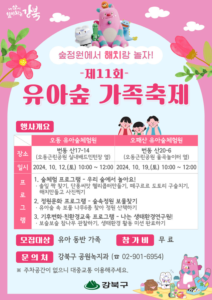 [시민일보 = 문민호 기자] 서울 강북구(구청장 이순희)는 오는 12일 오동 유아숲체험원, 19일 오패산 유아숲체험원에서 ‘제11회 유아숲 가족축제’를 개최한다.