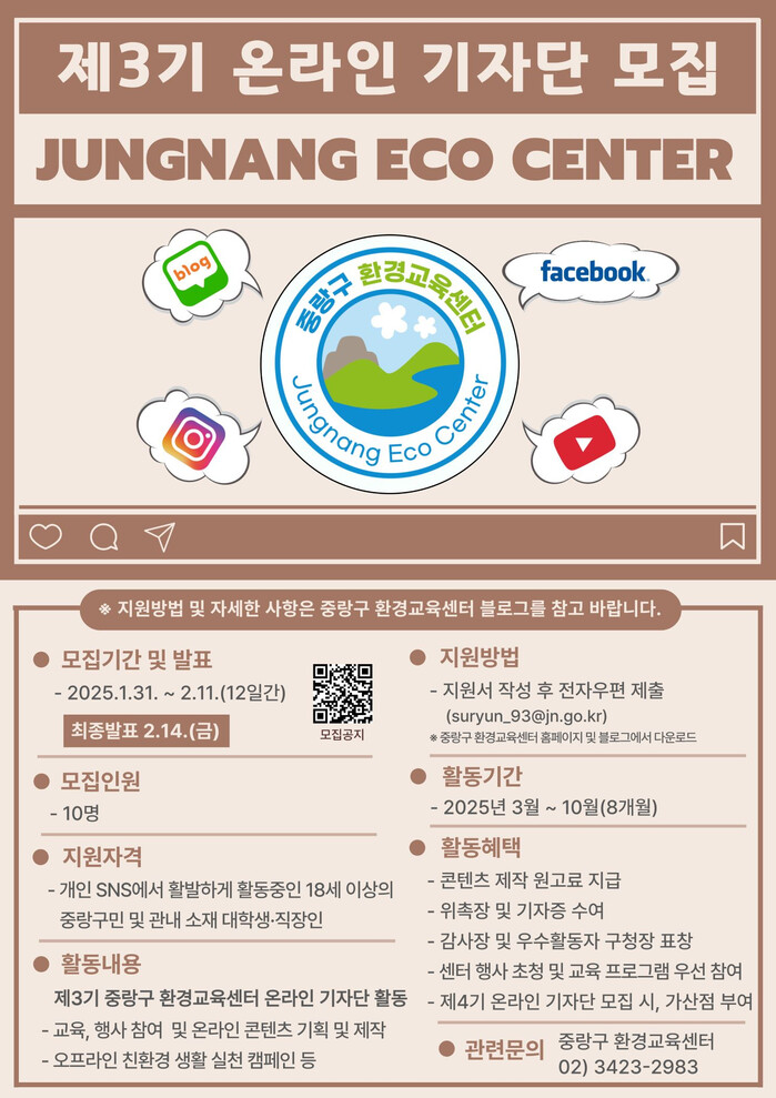 [시민일보 = 여영준 기자] 중랑구(구청장 류경기)는 오는 11일까지 제3기 중랑구 환경교육센터 온라인 기자단을 모집한다고 밝혔다.