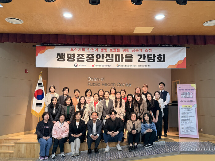 경기 오산시정신건강복지센터 부설 자살예방센터가 최근 오산시보건소 3층 대회의실에서 지역사회 유관기관 대표 및 실무자가 참여한 가운데 ‘2025년 생명존중안심마을 간담회’를 진행했다. 사진은 간담회에 참석한 관계자들이 기념 촬영을 하는 모습. (사진=오산시청 제공)