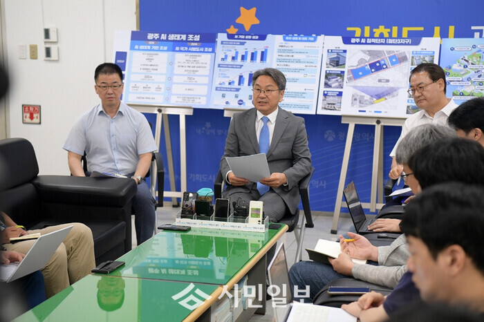 | ▲ 강기정 광주광역시장이 지난 8월18일 시청 기자실에서 기자들과 만나 인공지능(AI) 2단계 사업인 ‘AX(인공지능전환) 실증밸리 조성사업’ 계획을 밝히고 있다./광주광역시 제공 |