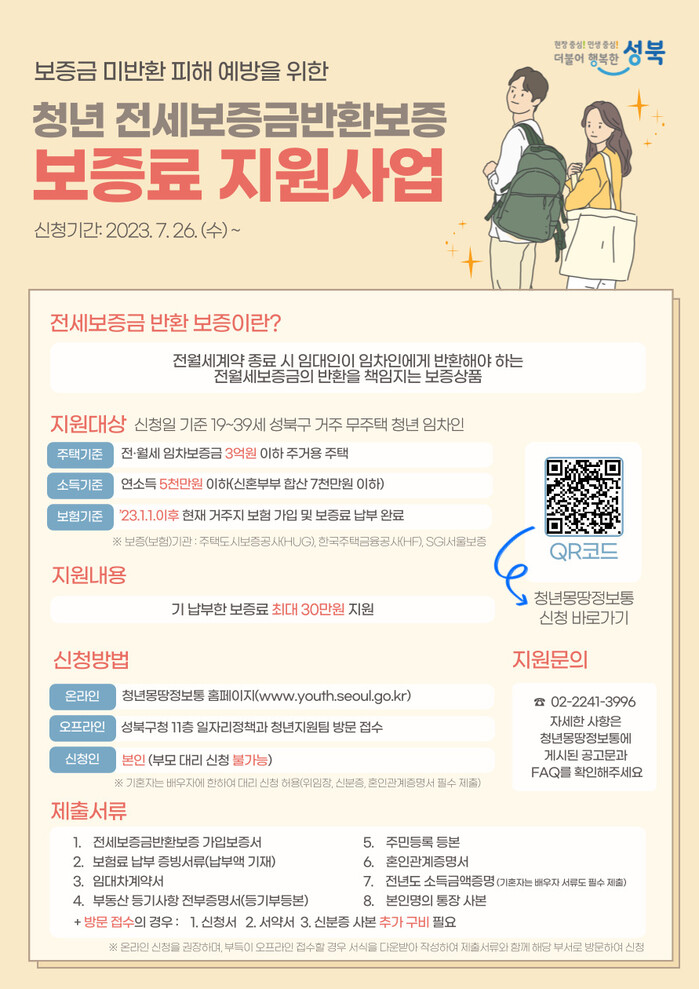 [시민일보 = 홍덕표 기자] 성북구(구청장 이승로)가 전세사기로부터 청년과 신혼부부를 보호하기 위해 전세보증금 반환 보증료를 최대 30만원까지 지원한다.