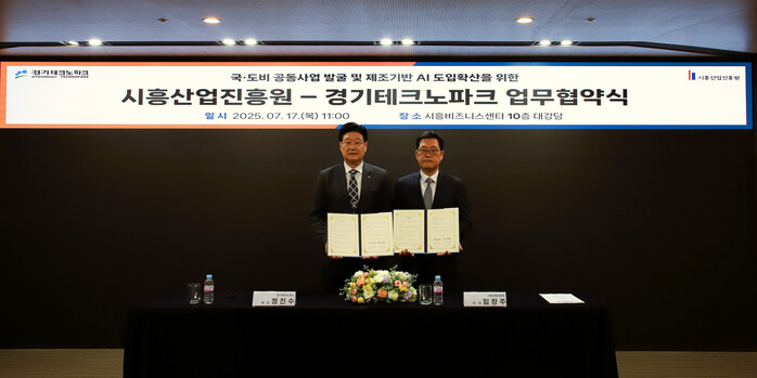 | ▲ 시흥산업진흥원은 경기테크노파크와 지난 7월 17일 중앙정부·경기도 지원사업 연계와 제조기반 인공지능(AI) 도입 확산, 공동사업 발굴을 위한 업무협약(MOU)을 체결했다 /사진제공=시흥산업진흥원 |