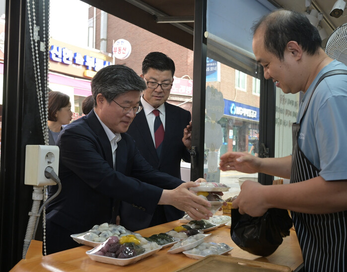 첫 방문지인 백학시장에서 김 구청장은 떡집, 순대집, 채소가게 등에 들러 상인들과 덕담을 나누고 명절 준비에 필요한 장을 봤다. 또한, 시장 골목골목 다니며 물가를 살피고, 소방시설과 위생 상태까지 꼼꼼히 살폈다.