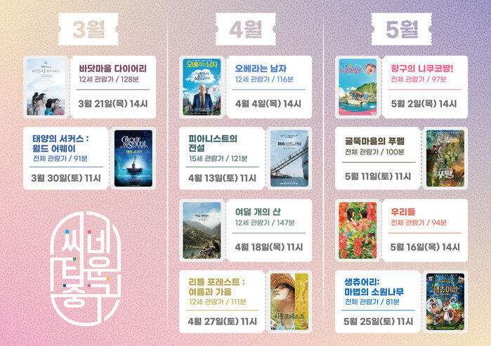 ‘씨네타운 중구’는 서울시 중구 거주민에 한해 무료로 중구문화재단 홈페이지를 통해 선착순 예약이 가능하다(1인 4매). 3월 상영작은 현재 신청 가능하며 4월 상영작은 오는 18일부터, 5월 상영작은 4월 15일부터 접수받는다.