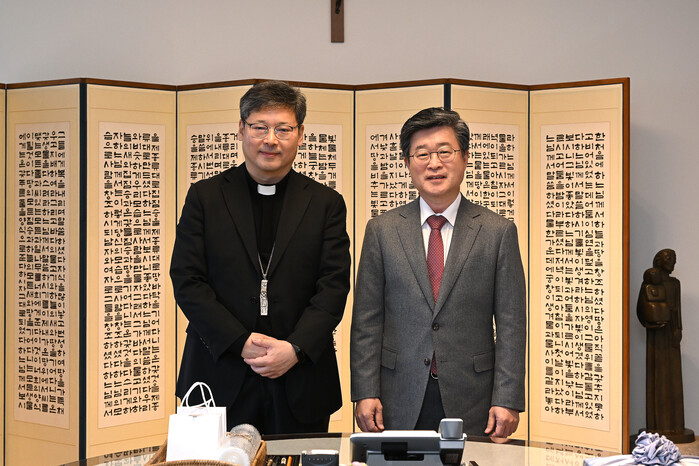 [시민일보 = 여영준 기자] 김길성 서울 중구청장이 지난 14일 천주교 서울대교구 대교구장실에서 정순택 대주교와 신년 인사를 겸한 환담을 나누며 지역사회 발전을 위한 협력 방안을 논의했다.