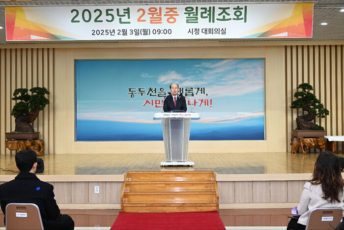 경기 동두천시가 3일 시청 대회의실에서 2월 중 명예시장으로 위촉된 김문옥 주한외국인 태권도문화협회 회장과 전 직원이 참석한 가운데 월례조회를 개최했다. 사진은 월례조회에 참석한 박형덕 시장이 발언하고 있는 모습. (사진=동두천시청 제공)
