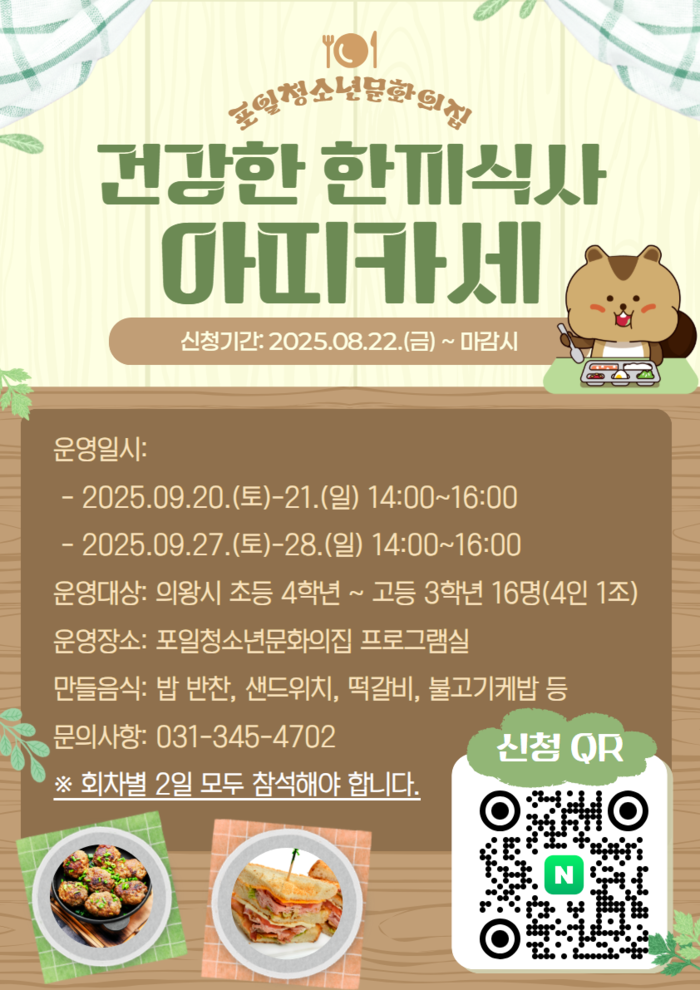 프로그램은 초등 4학년부터 고등학생까지 전 연령대를 대상으로 9월 20일~21일, 9월 27일~28일 총 2회 차로 운영되며, 각 회 참여 인원은 16명이다. 신청은 선착순으로 진행되며, 안내문의 큐알(QR)을 통해 가능하다.
