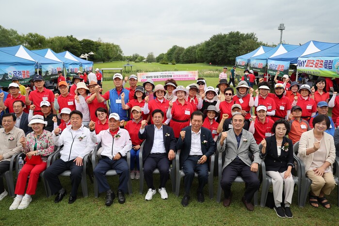 박강수 서울 마포구청장이 최근 ‘제8회 마포구협회장배 파크골프대회’가 열린 상암동 노을공원 파크골프장을 찾았다. 사진은 박 구청장(앞줄 가운데)이 파크골프대회 참여자들과 함께 기념촬영을 하고 있는 모습. (사진=마포구청 제공)