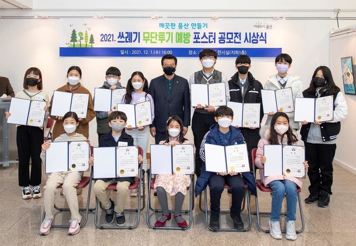 서울 용산구가 지난 1~2일 ‘쓰레기 무단투기 예방 포스터 공모전’ 수상작 전시회를 개최했다. 구는 지역내 학생을 대상으로 쓰레기 무단투기 예방 포스터 공모전을 열어 접수된 175점 작품 중에서 최우수상(1점), 우수상(2점), 장려상(5점), 노력상(10점)을 선정했다. 사진은 지난 1일 성장현 구청장(뒷줄 가운데)이 공모전 수상자들과 기념촬영을 하고 있는 모습. (사진제공=용산구청)