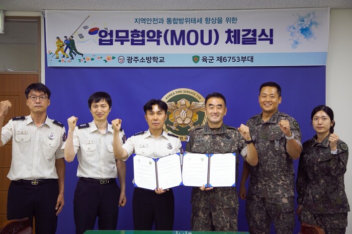 [광주=정찬남 기자] 광주소방학교와 육군 제6753부대는 23일 소방학교 회의실에서 지역 안전과 통합방위태세 향상을 위해 공동 협력 체계를 구축키로 하고 업무협약을 체결했다.