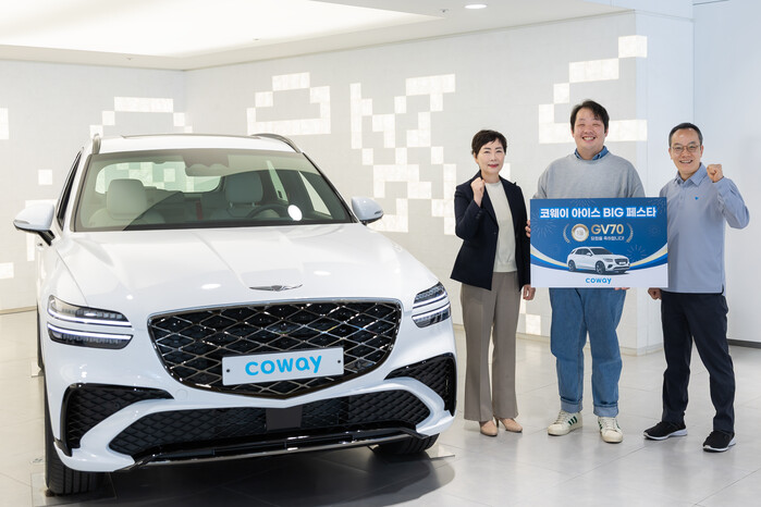 | ▲ ‘아이스 빅 페스타’ 1등 경품 제네시스 GV70 당첨자 이승현씨(중앙)가 코웨이 가산지국 권명숙 지국장(왼쪽), 문광열 코닥(오른쪽)과 기념 촬영을 하고 있다. (사진=코웨이 제공) |