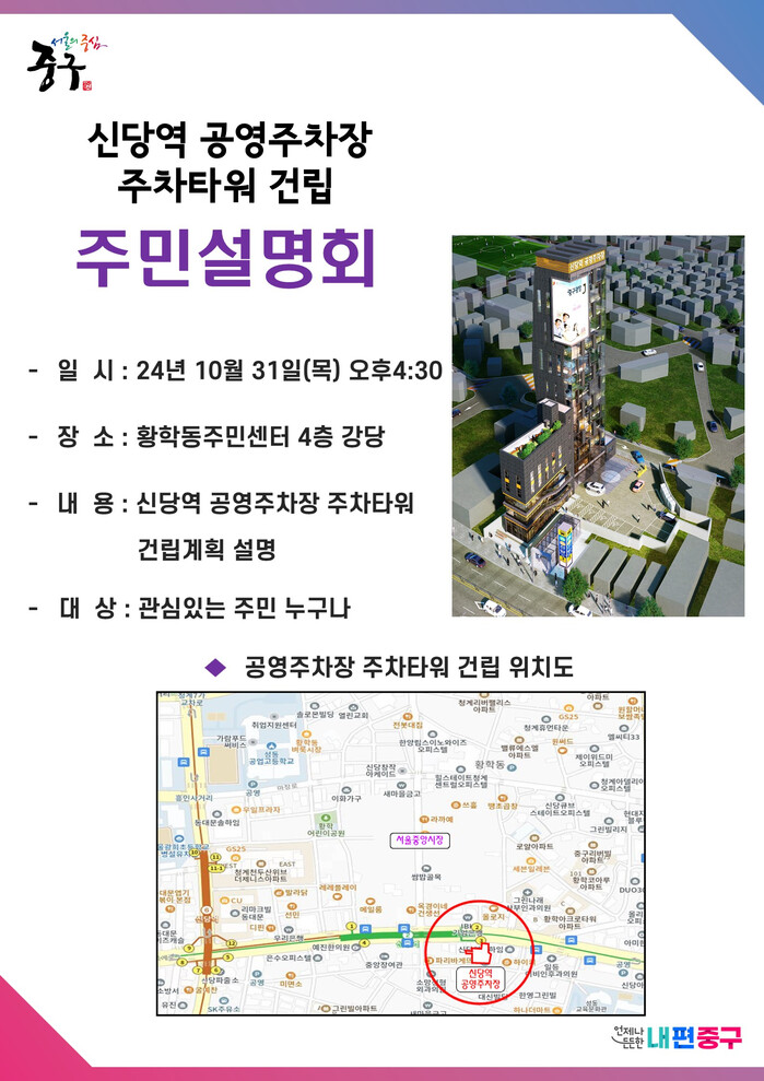 [시민일보 = 여영준 기자] 서울 중구가 오는 31일 오후 4시30분에 황학동주민센터에서‘신당역 공영주차장 주차타워 건립’과 관련해 주민설명회를 연다.