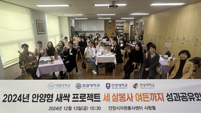 이번 성과공유회에서는 ▲2025년 새싹 프로젝트 사업추진 결과보고 ▲4개 대학별 성과 발표 ▲유아교육과 학과장 및 참여 어린이집 평가 공유 ▲자원봉사 참여증서 전달 등이 진행될 예정이다. 행사에는 안양형 새싹 프로젝트 대학연합봉사단, 4개 대학 유아교육과 학과장, 안양시어린이집연합회 관계자 등 약 30명이 참석해 한 해의 성과를 함께 나눈다.