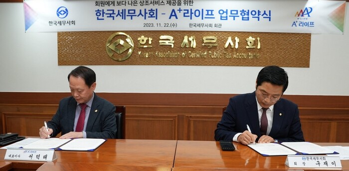 이번 업무협약식에는 에이플러스라이프 서덕태 대표이사와 이경원 전무, 한국세무사회 구재이 회장과 김선명 부회장이 참석했다.