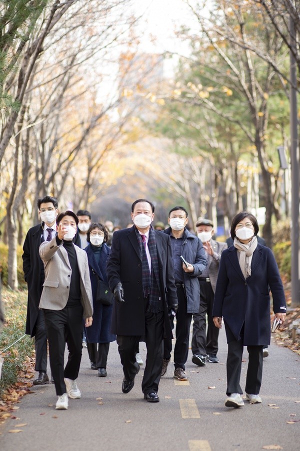 유동균 서울 마포구청장이 최근 경의선숲길(염리동~대흥동~신수동) 주민의견 수렴을 위해 이민석 마포구의회 의원 및 지역주민들과 함께 경의선숲길을 걸으며 현장 점검을 실시했다. 사진은 유 구청장(앞줄 가운데)이 경의선숲길 현장점검을 실시하고 있는 모습. (사진제공=마포구청)