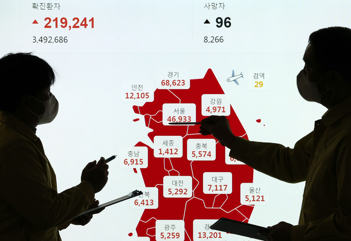 중앙방역대책본부(이하 방대본)는 이날 오전 0시 기준으로 신규 확진자가 21만9241명 늘어 누적 349만2686명으로 집계됐다고 밝혔다.