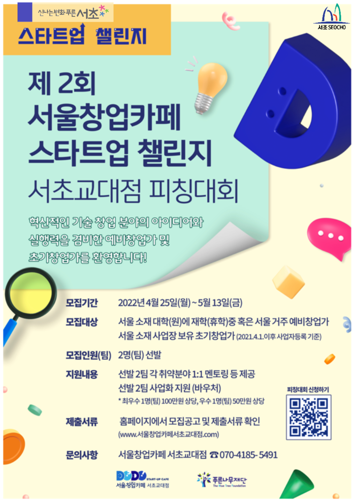 [시민일보 = 이대우 기자] 서초구는 서울창업카페 서초교대점이 오는 13일까지 ‘제2회 스타트업 챌린지’의 피칭대회에 도전할 예비창업가를 모집한다.